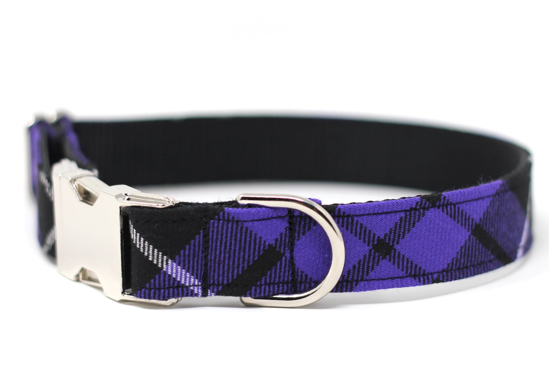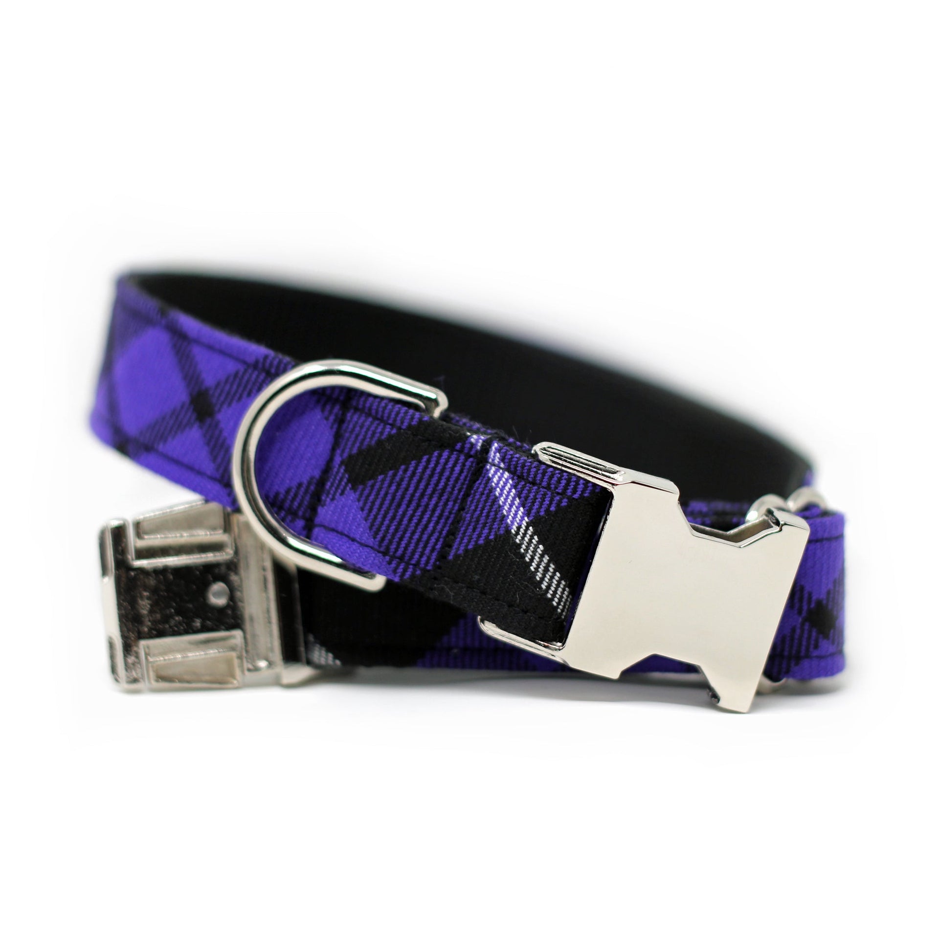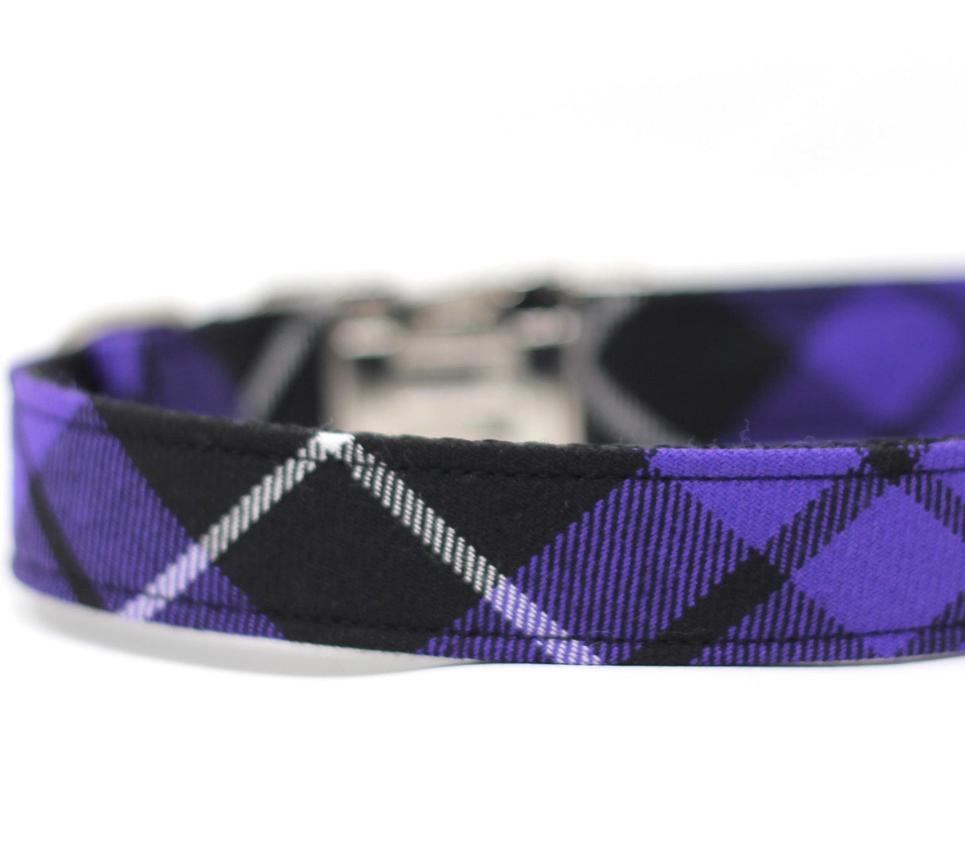 Your pup will look great and feel comfortable in this rich purple plaid collar. This collar will glam up your pup's wardrobe and will look perfect paired with a matching leash. Add some cute attitude to the overall look of your doggie while remaining safe by adding the personalization to this collar. Please measure your pet prior to purchase to ensure a proper fit. Not all of our buckles are suitable for small breed dogs.