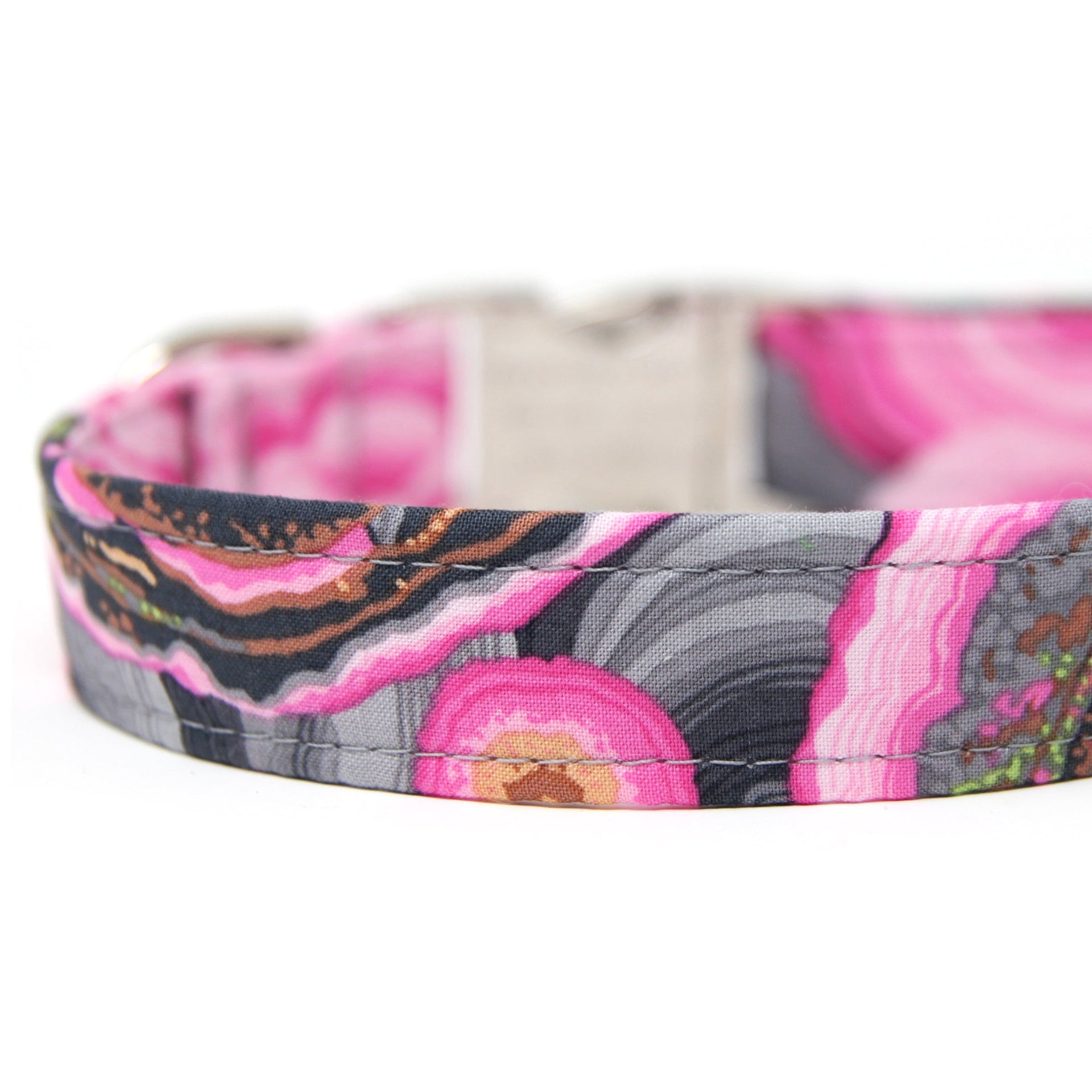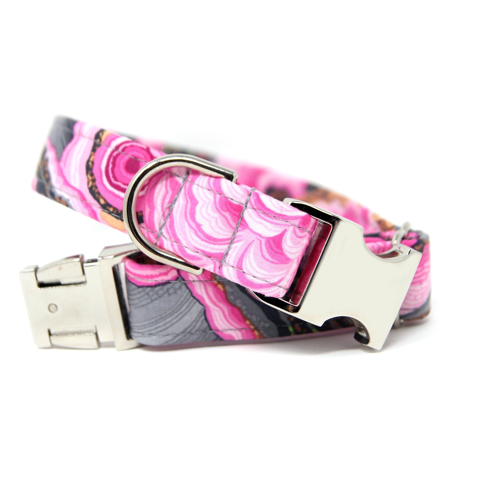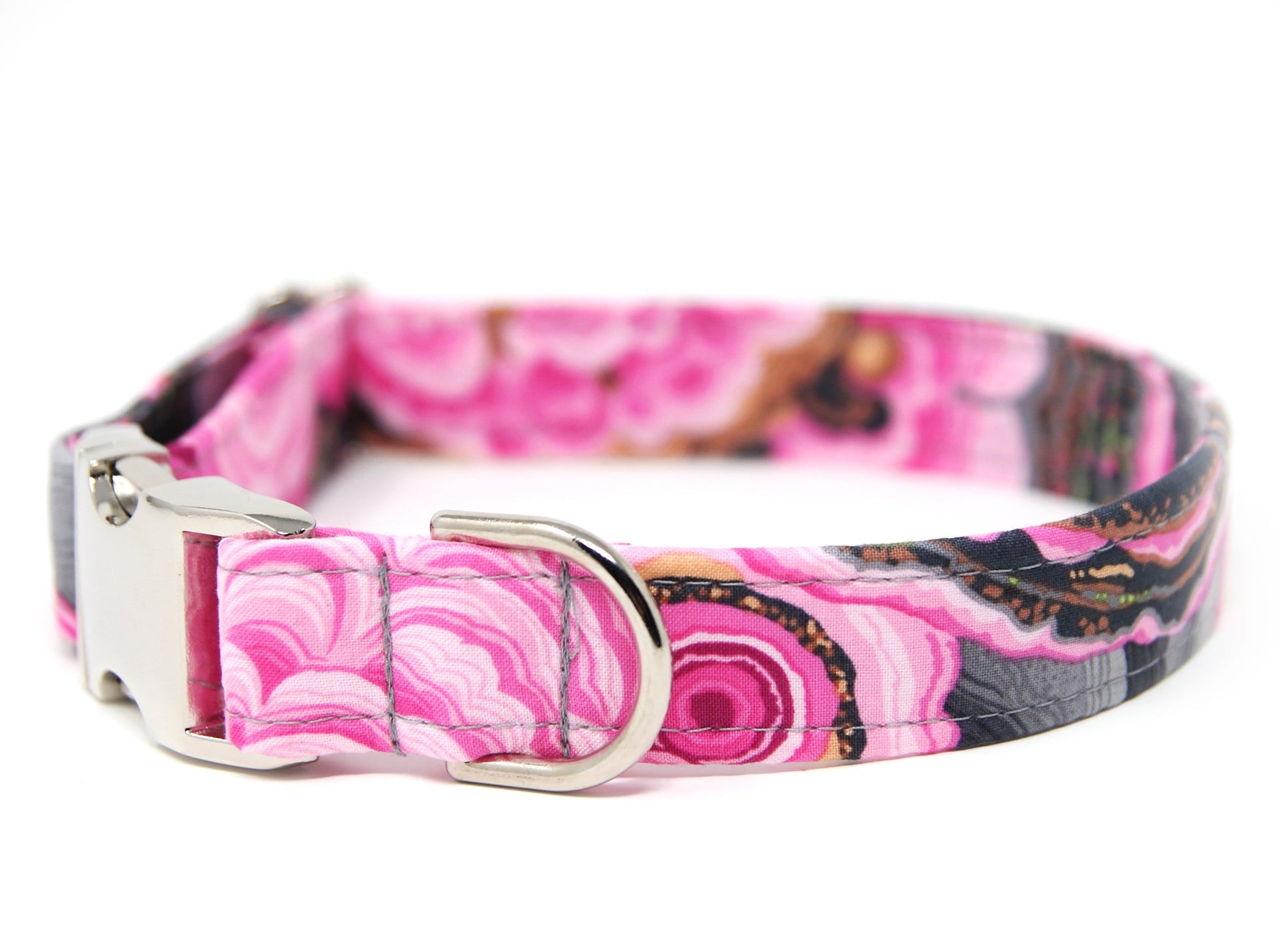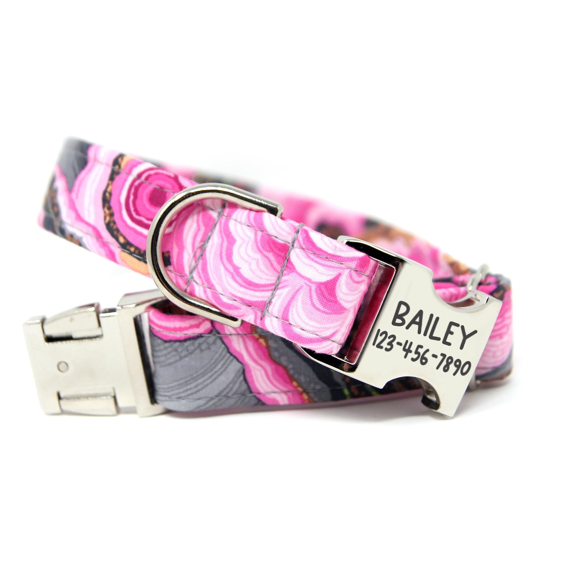 Your pup will look great and feel comfortable in this super stylish pink floral collar. This beautiful dog collar will totally glam up your pup's wardrobe and will look perfect paired with a matching leash. Add some cute attitude to the overall look of your doggie while remaining safe by adding the personalization to this collar. Please measure your pet prior to purchase to ensure a proper fit. Not all of our buckles are suitable for small breed dogs.