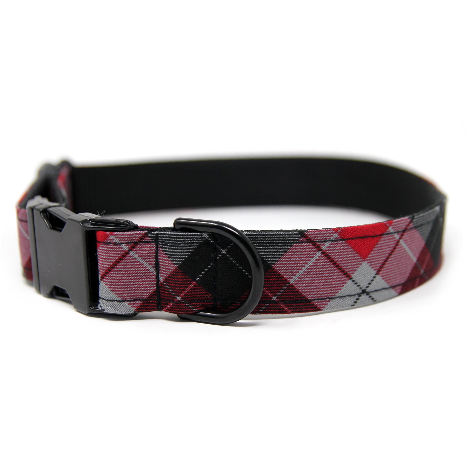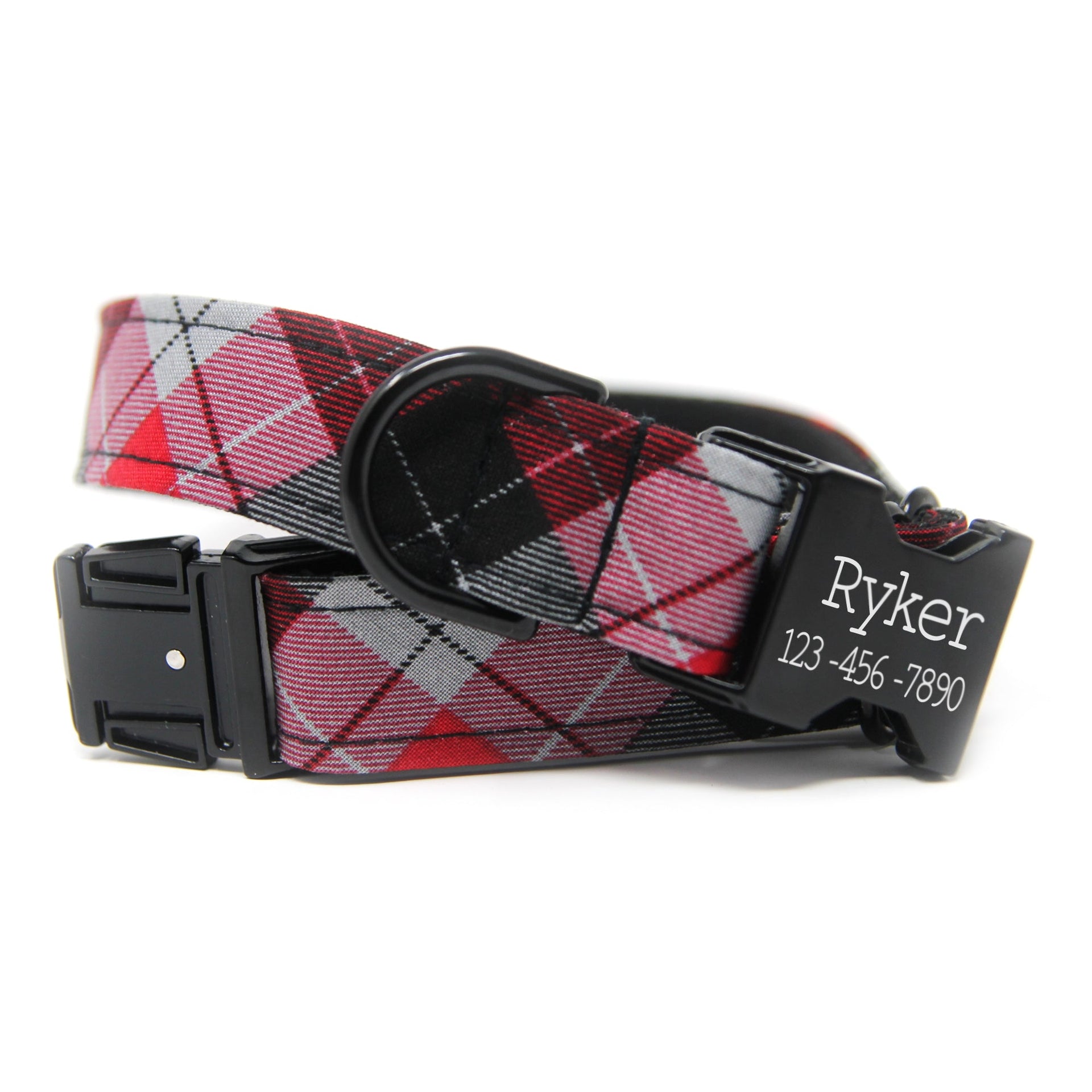 Give your companion the luxury they deserve with this red and black tartan dog collar. Your pooch will look uber stylish while staying safe with the optional personalization. No fear of the tags falling off because we add the engraving right onto the buckle. Please measure your pet prior to purchase to ensure a proper fit. Not all of our buckles are suitable for small breed dogs.