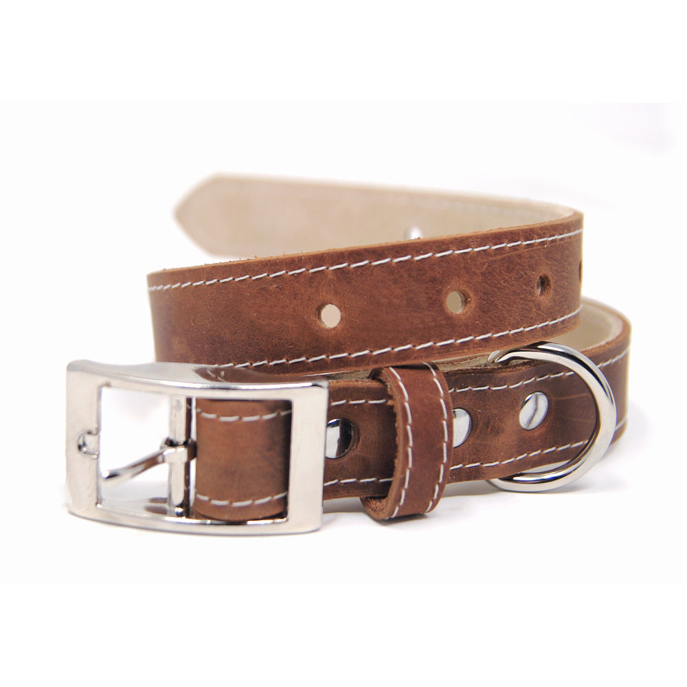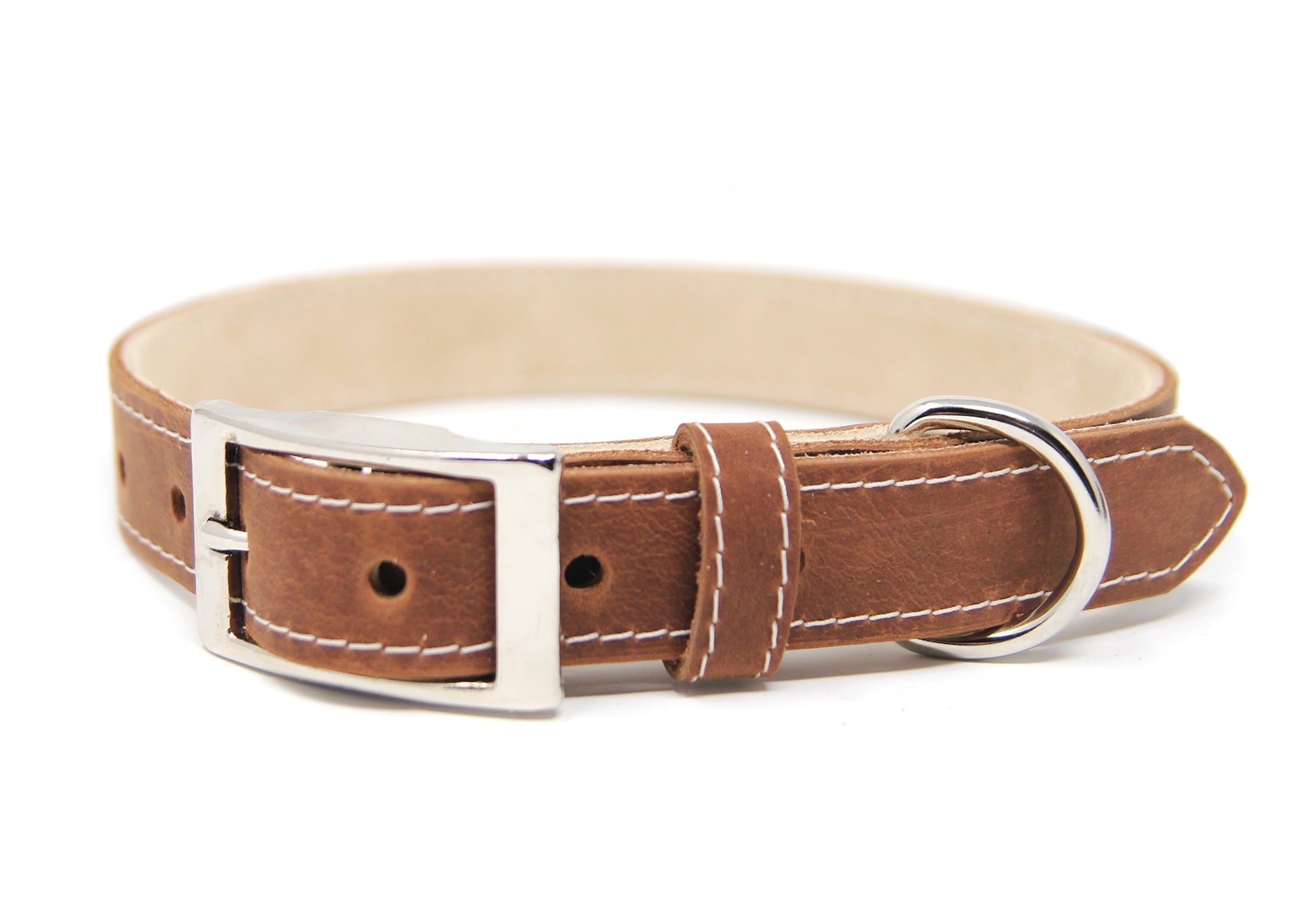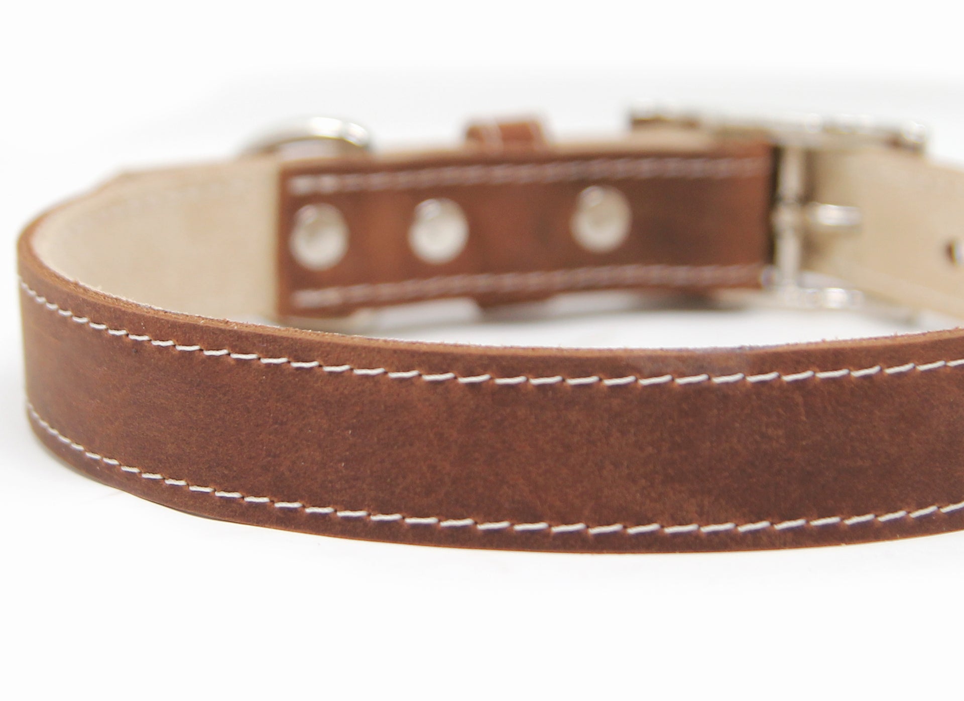 This collar is crafted from premium, hand-cut tanned leather in a rich, rustic brown shade, providing not only a classic look but exceptional strength. The interior features a soft tan suede lining, designed for maximum comfort against your dog's neck.
