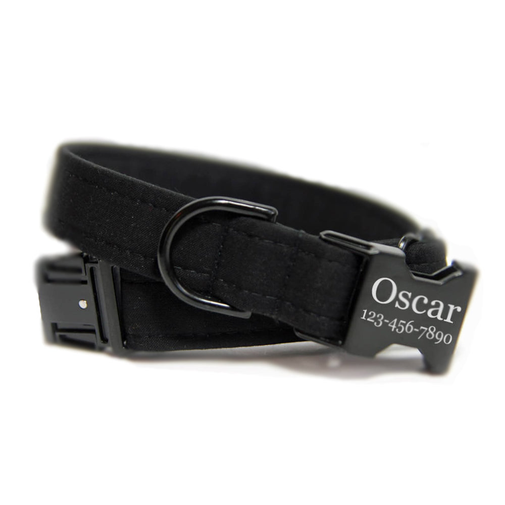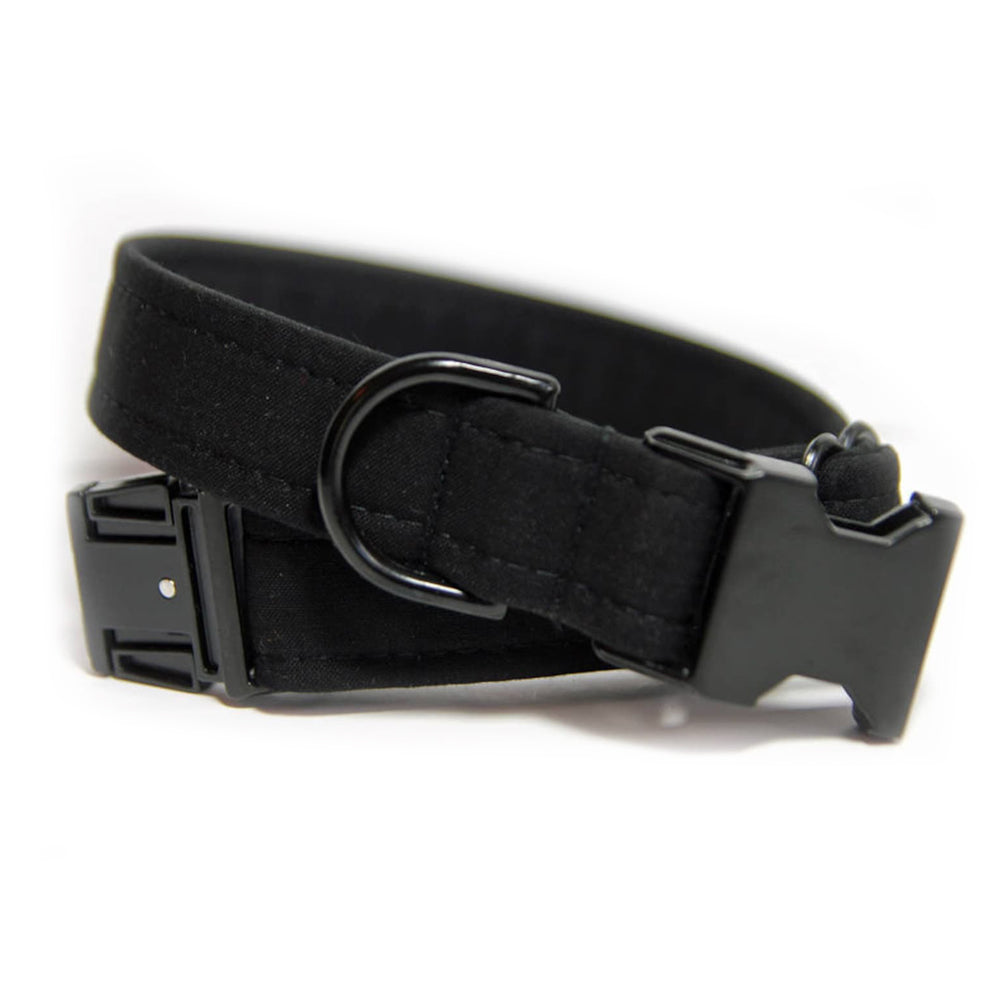 Our all blacked out dog collar is a super classy look for your pup. Handmade in the USA with the finest materials available. This collar is available in other buckles if you don't want all black. Please measure your pet prior to purchase to ensure a proper fit. Not all of our buckles are suitable for small breed dogs.